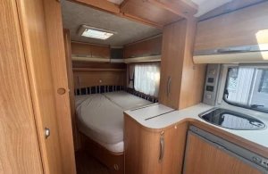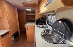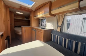 In de praktische rondzit waarmee de caravan is uitgerust, kunt u genieten van heerlijke maaltijden en gezellige avonden. Centraal in de caravan bevindt zich de middenkeuken, uitgerust met een spoelbak, kraan en 3-pits kooktoestel met alle ruimte, u heeft namelijk 2 pitten bijelkaar en 1 pit bij de wasbak, daar hebben de ontwerp(st)ers over nagedacht. Voor een snelle toevoer van warm water is er een 5 liter boiler aanwezig. De ingebouwde koelkast met vriesvak is uitgevoerd in een ruime uitvoering. Al uw keukenspullen passen in de handige ladekast.