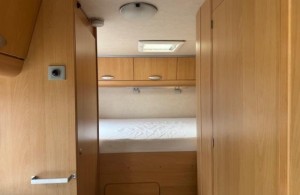 Het vaste bed achter is voorzien van een lattenbodem en een comfortabel matras met een afmeting van 200cm x 140cm.