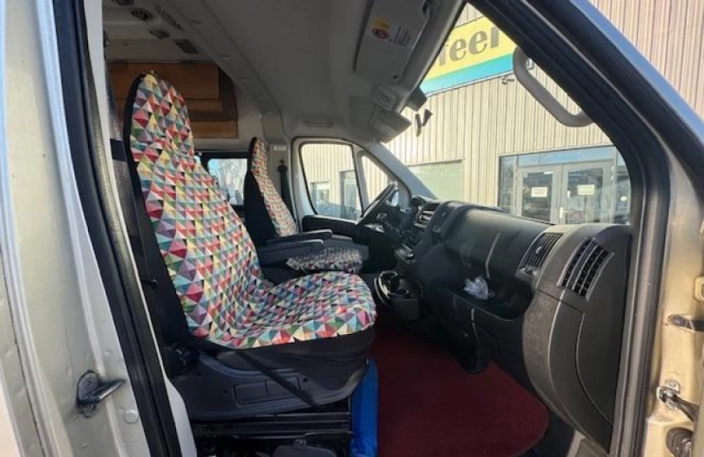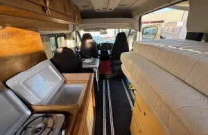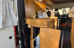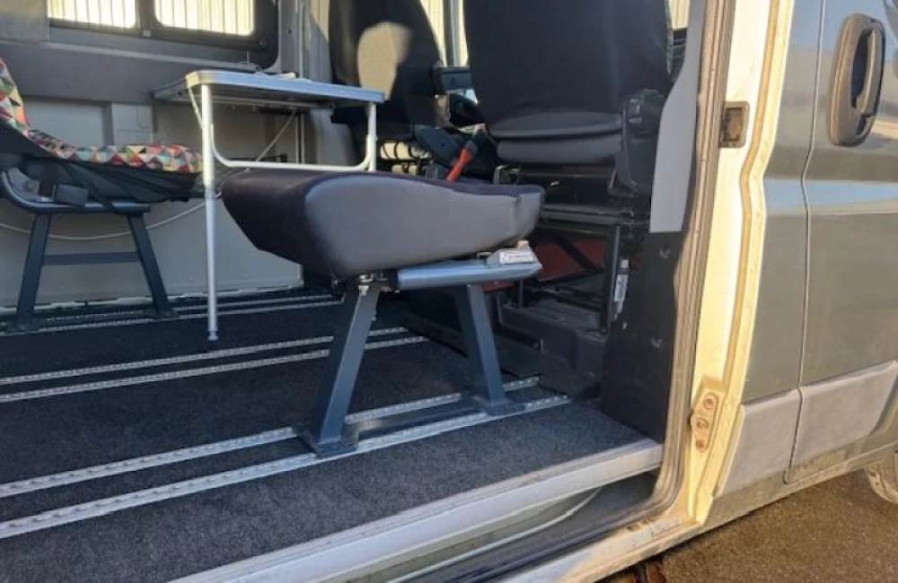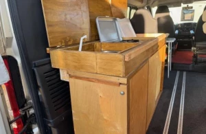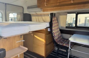 De camper heeft een kleine zit met en zonder rugleuning, een prettige gelegenheid om rustig te lezen, te spelen of wat te drinken. Het keukenblok is links in de camper gemonteerd onder het bed en is onder anderen uitgerust met een 40 liter koelbox, 2-pits gaskomfoor, spoelbak en een kraan.