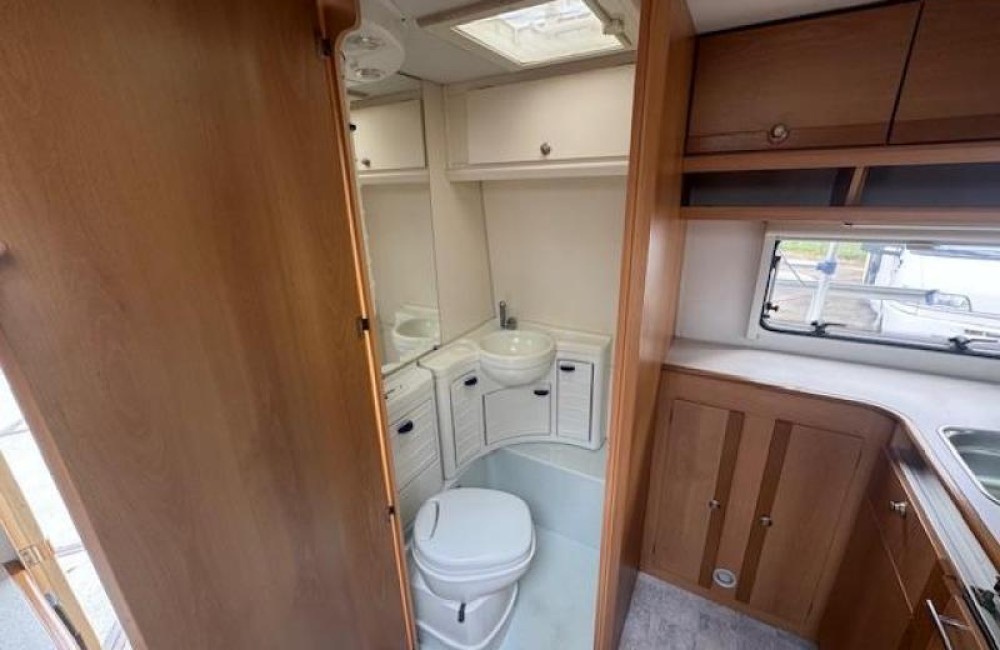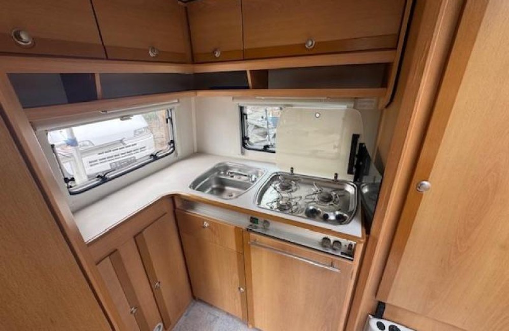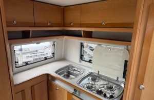 De eindkeuken, achterin de caravan geplaatst, beschikt over voldoende berguimte en is functioneel en compleet ingericht met een spoelbak, kraan en 3-pits kooktoestel. Een ingebouwde 5 liter boiler voorziet u van warm water. De inbouwkoelkast (77 liter) met vriescompartiment heeft een grote inhoud.