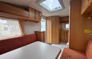 Doordat deze caravan geen vast bed heeft toont deze heel ruim van binnen en weegt van zich zelf nog géén 1000 Kg.