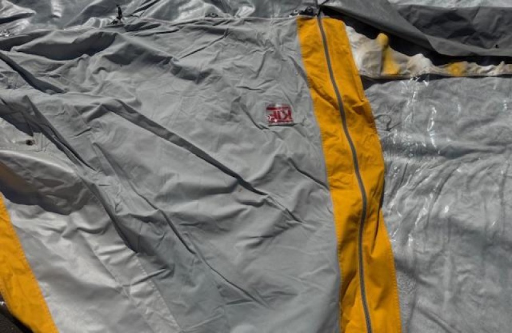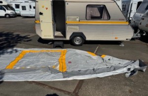 Zo ook de originele voortent, zoals u op de foto wellicht ziet is deze haast niet gebruikt, deze voortent is voorzien van een lichtgewicht frame. Tevens wordt er een nieuwe dakluifel bijgeleverd van 3 meter voor het gemak tijdens de kortere stops.